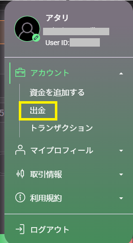 取引画面の右上アイコンからメニューを開き、「出金」を選択し、出金ページへと進みます。