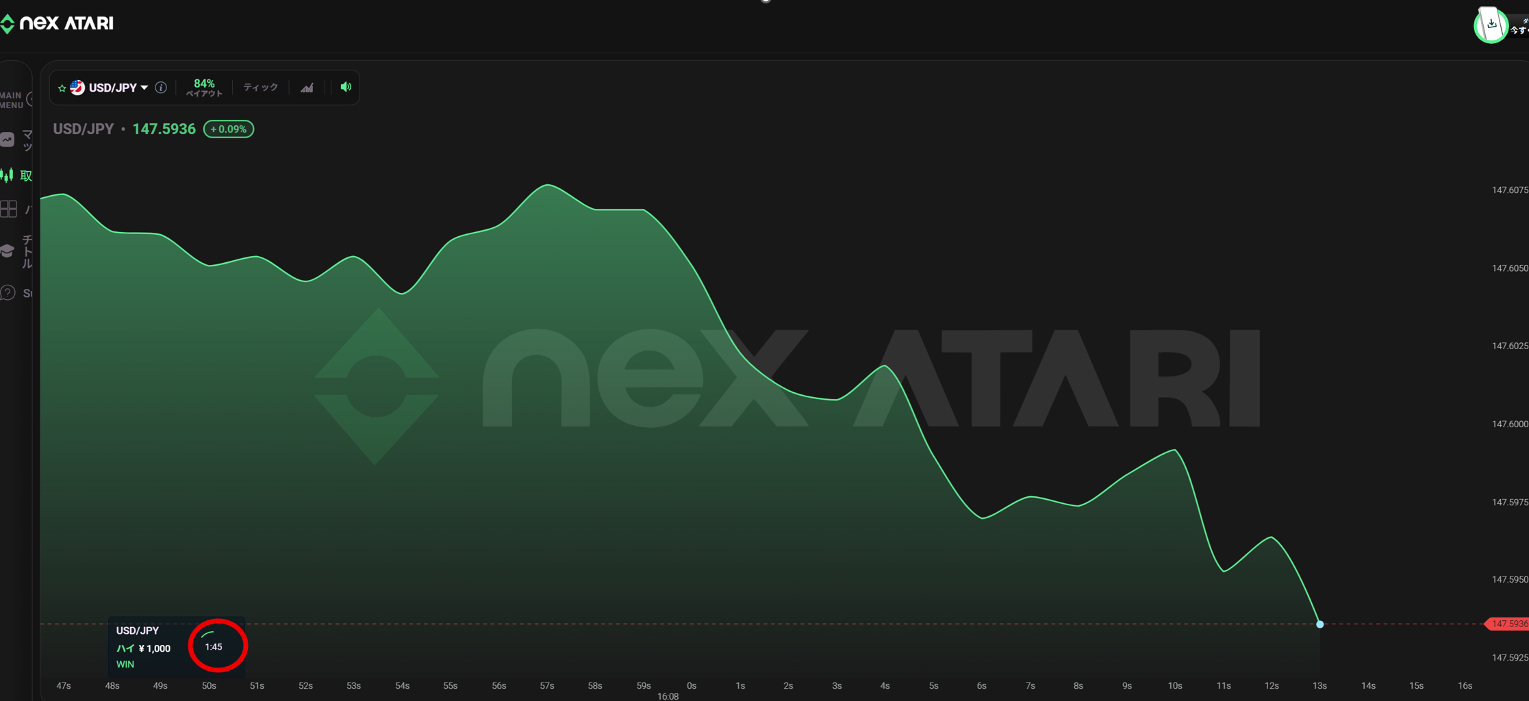 取引画面の取引時間(下記の画像の赤丸)の表示部分、または取引画面の下の「オープンポジション」の途中売却をクリックすると、「途中売却の実行」ボタンが表示されます。 このボタンが表示されている間は、ポジションを転売することが可能です。